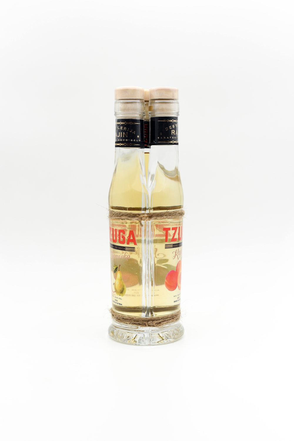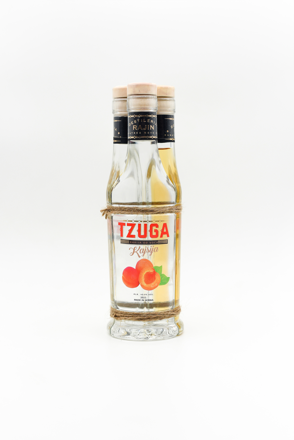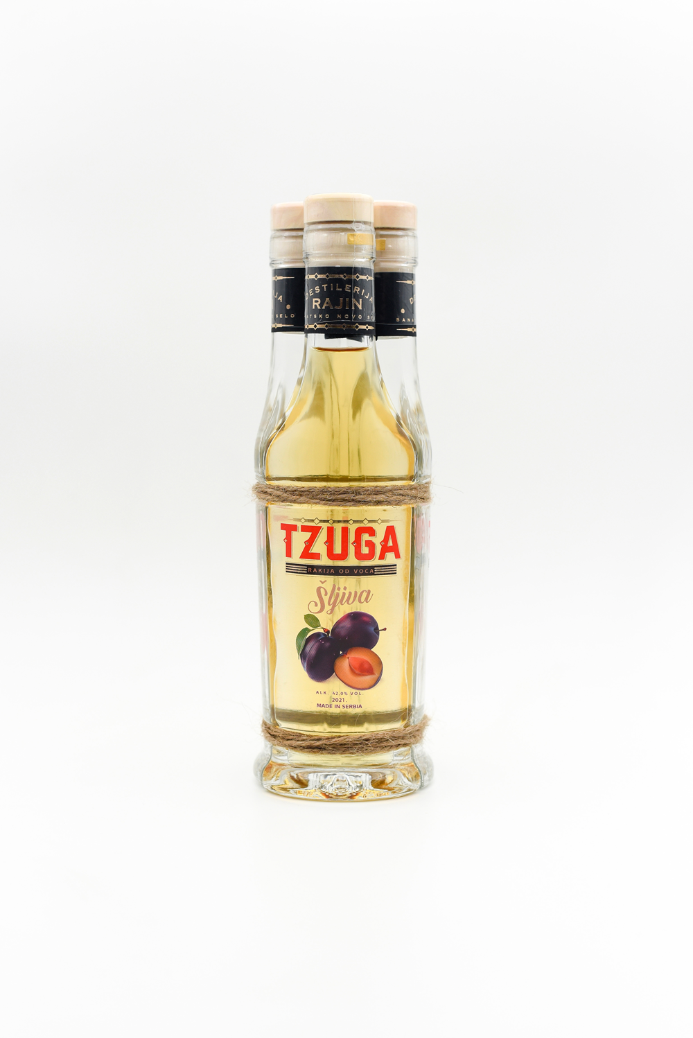 TZUGA 3 u 1 je revolucionarno poklon pakovanje sa 3 boce od 100ml koje se uklapaju u jednu bocu. Ovo pakovanje namenjeno je muškoj populaciji i sadrži ove rakije: Šljiva 100ml 42% vol. Kajsija 100ml 40% vol. i Vilijamovka 100ml 40% vol. U polietilenskoj tubi sa drškom od kanapa. Jednostavno savršen poklon!